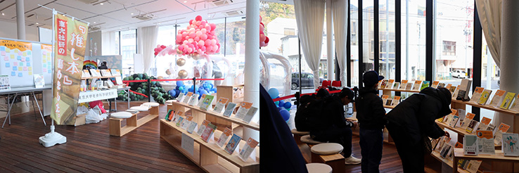 多数の来場者があり、座り込んで本を読む高校生(中学生というより)の姿も見られました。お年寄りを含め幅広い釜石市民の皆様に喜んでいただけたようです。イベント終了後には、釜石市役所の方から市立図書館に同様の展示スペースを作りたいとのお申し出を受け、ご快諾した次第です。